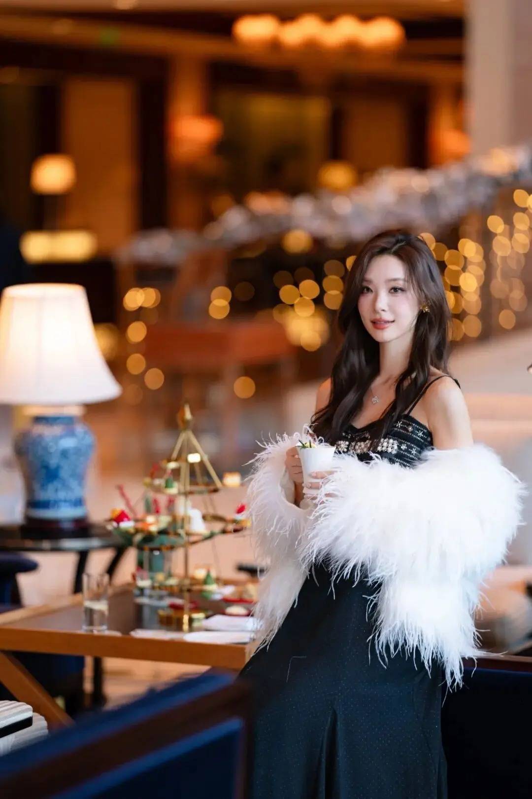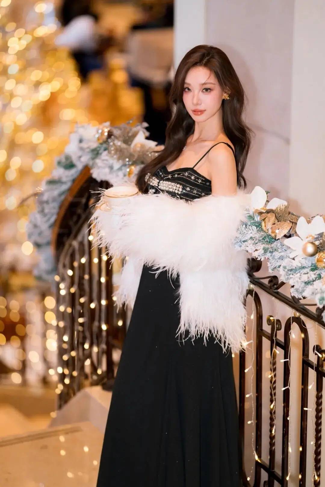 人物轻靠装饰栏杆,身形舒展站直,松弛里裹着优雅的精致——这姿势把大气和柔媚揉得刚好。角度取微侧平视,衬得身形修长又舒展。穿搭选黑裙搭毛绒披肩,冷艳里掺了柔糯质感。场景是暖光装饰的室内空间,朦胧灯效裹出氛围,装饰树当衬景