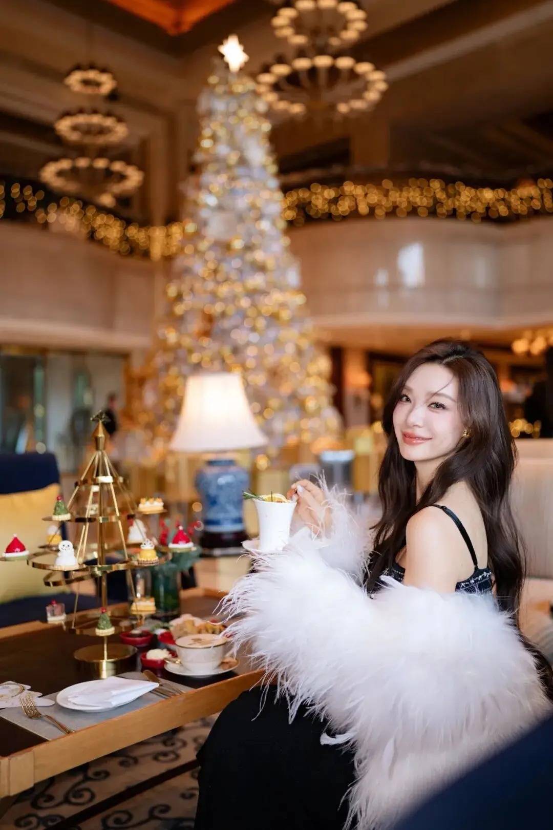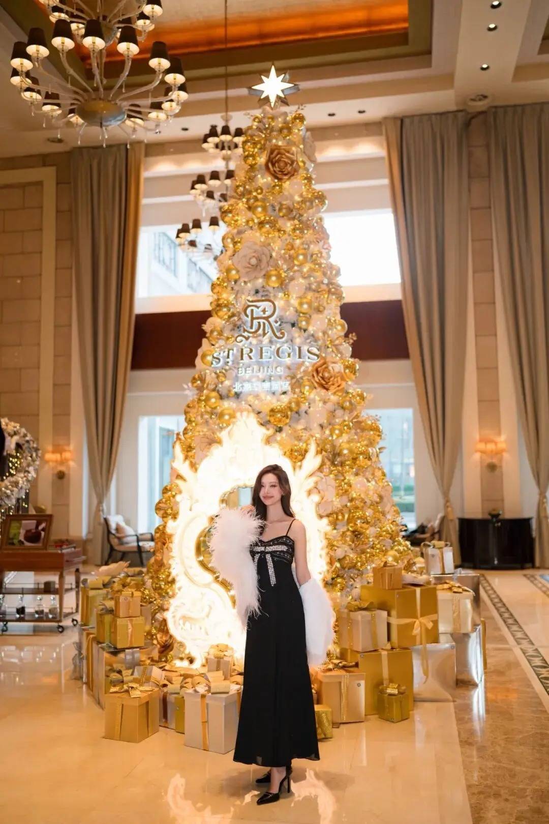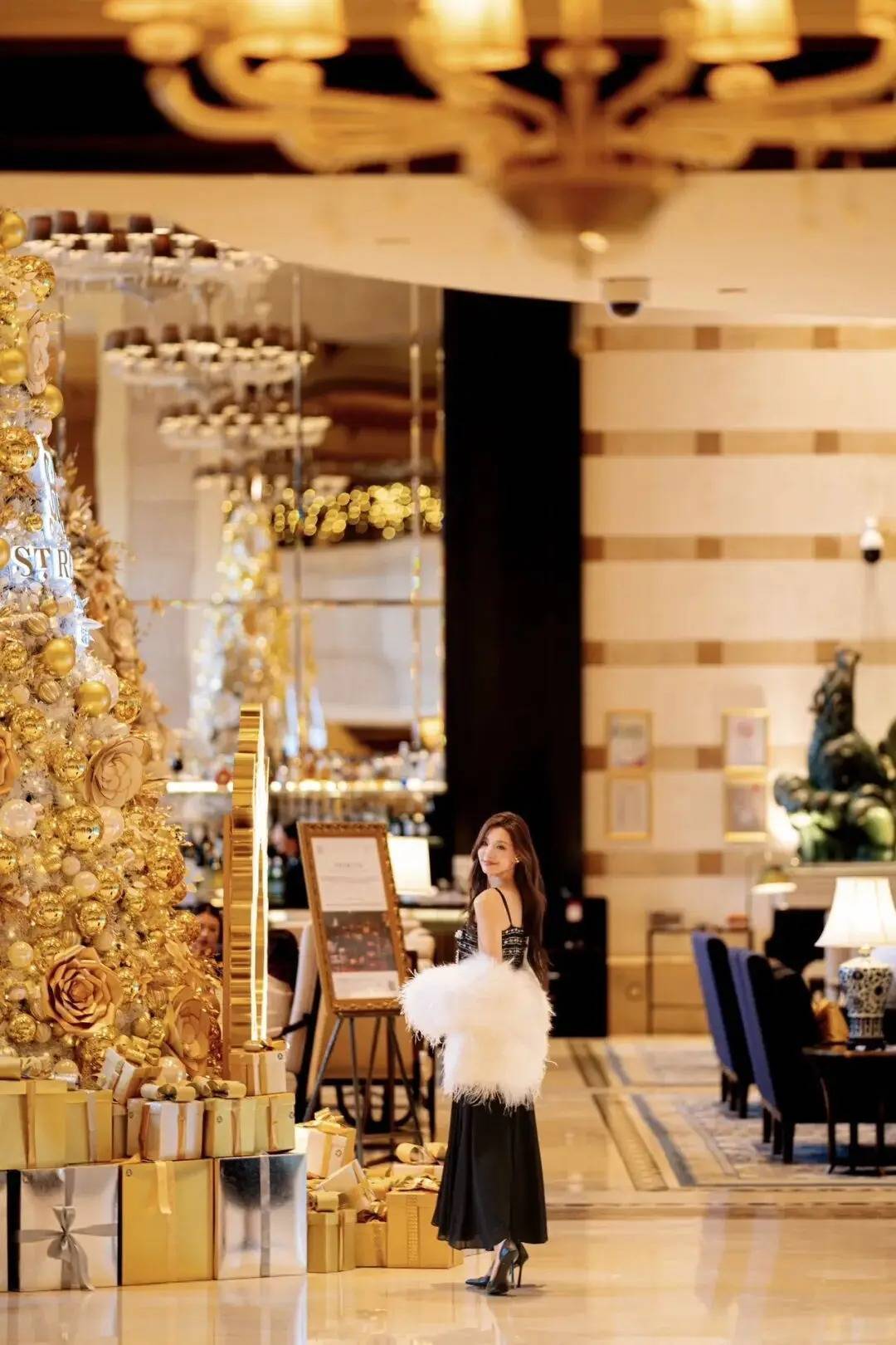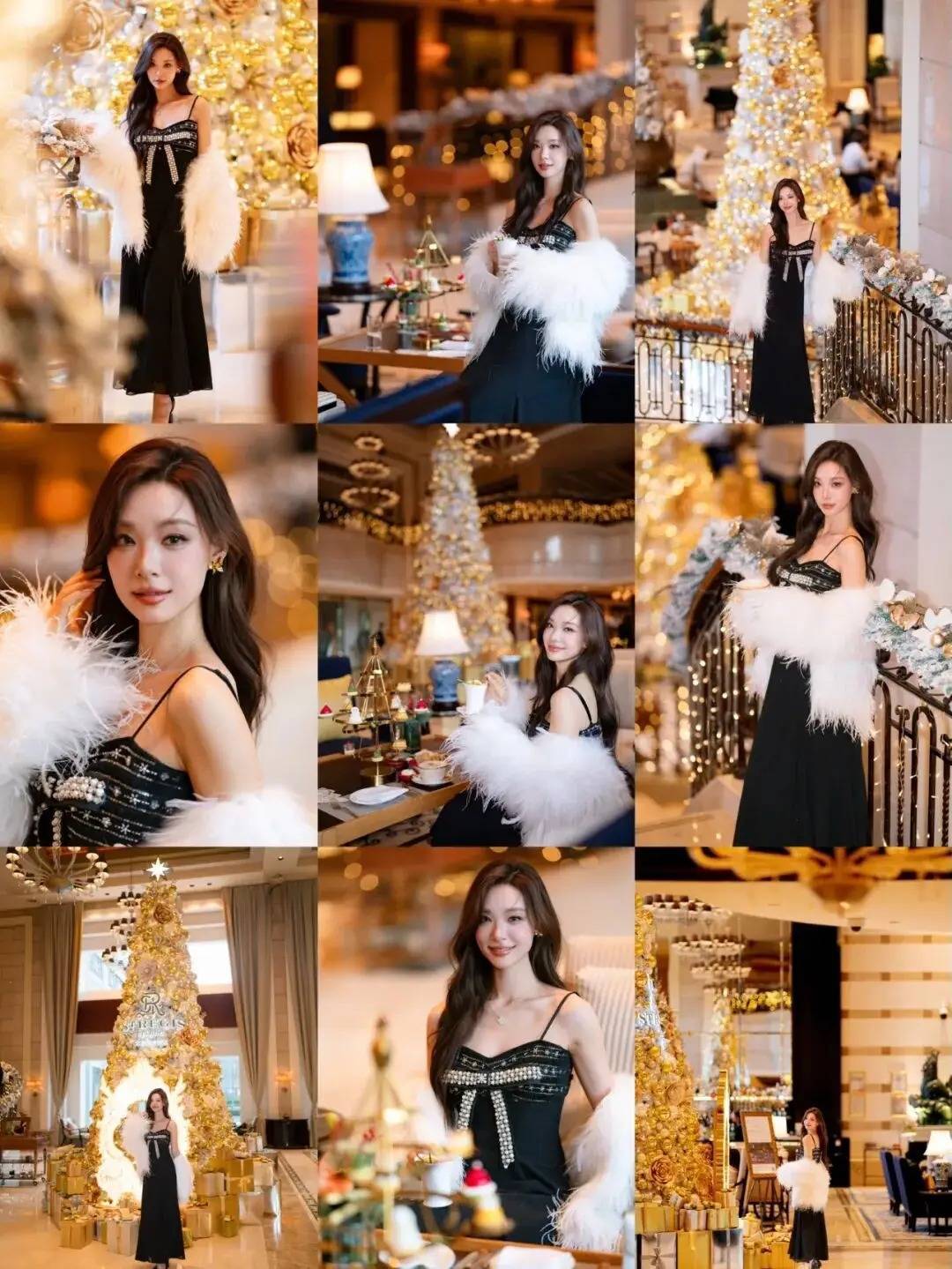 人物放松站直,一手轻搭披肩,不用刻意凹造型——松弛的状态最出片。角度选正面微侧,衬得身形修长又舒展。穿搭是黑裙配毛绒披肩,冷艳里裹着柔糯质感。场景是暖调装饰的大厅,灯光裹出朦胧氛围,装饰树和礼盒当背景,贵气又随性